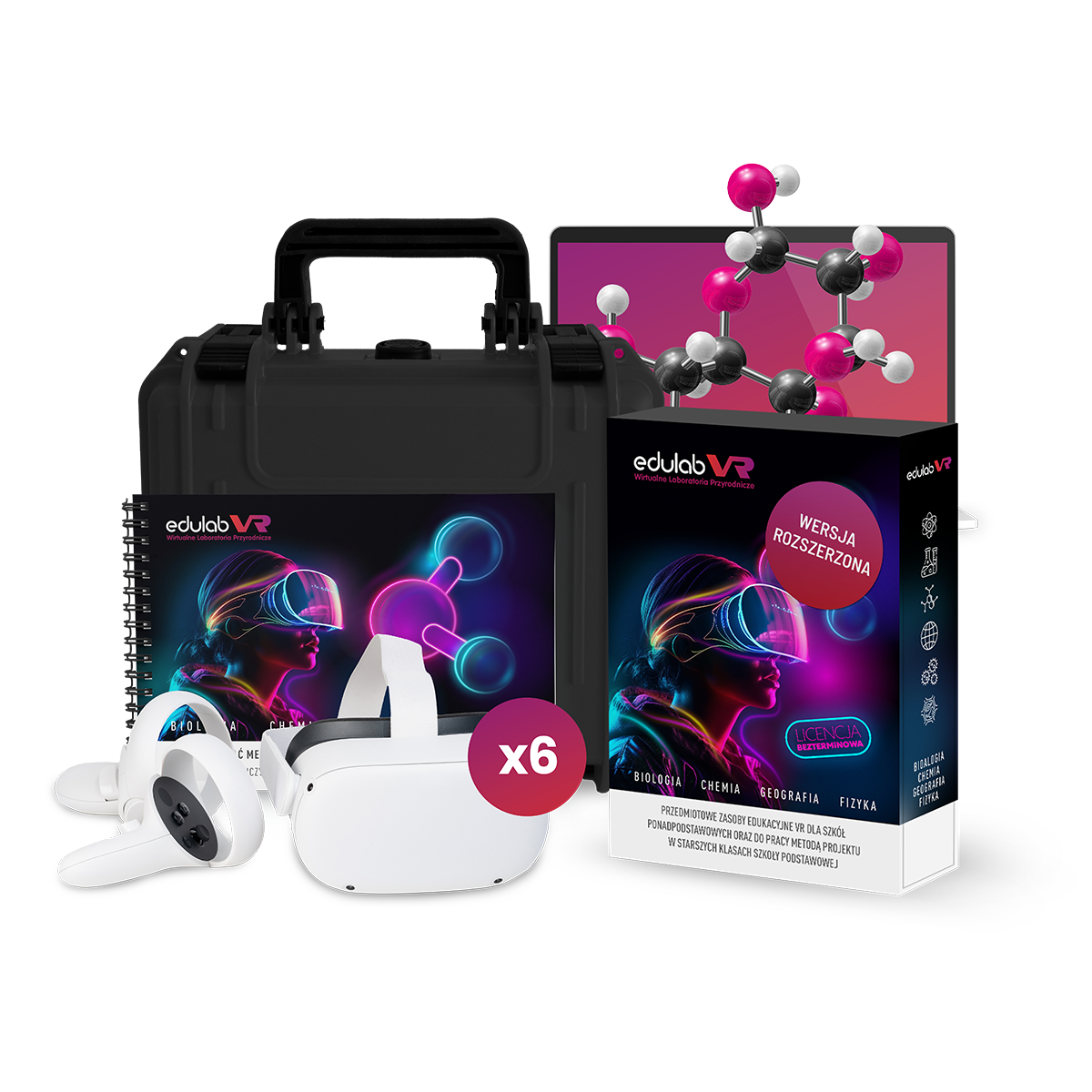 Chcesz w pełni korzystać ze wszystkiego, co oferuje edukacja w wirtualnej rzeczywistości? Sprawdź eduLabVR – wersja rozszerzona, gdzie znajdziesz oprogramowanie do nauki biologii, chemii, fizyki i geografii z licencją bezterminową, a także zestaw aż 6 najwyższej jakości gogli VR wraz z ładującą walizką. Korzystaj z atrakcyjnych i angażujących zasobów dla uczniów i nauczycieli w postaci wysokiej jakości modeli 3D, filmów 360°, grafik, zdjęć sferycznych, symulacji doświadczeń oraz interaktywnych ćwiczeń.